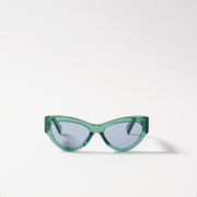 Upcycled + earth-conscious green Italian acetate frame with bio nylon teal lens offering 100% UVA+UVB protection.