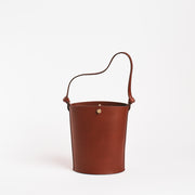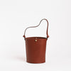Hilma takes the shape of an oblate ellipsoid with gradual widening at the top, and features a hand knotted strap, drop pocket with zipper and card slot, and a custom knurled knob brass pull release closure.