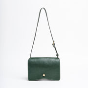 Val features three separate interior compartments, and a cover flap that locks closed with our custom solid brass hexagonal hardware. Organized and minimalist with a winged bottom edge, Val has an adjustable length strap with solid brass buckle that allows for wear high across the chest, over the shoulder or lower as a traditional crossbody.
